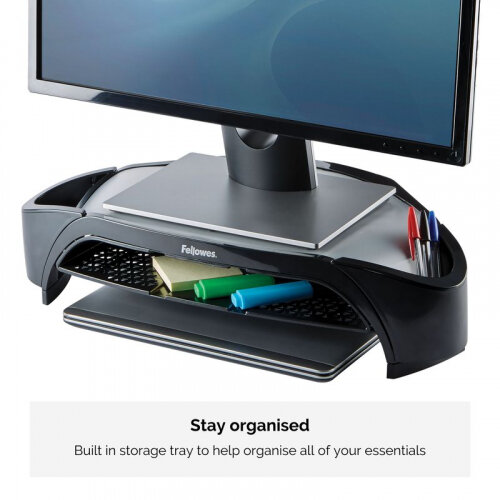The Fellowes Smart Suites Monitor Riser Plus places monitor at comfortable viewing position to prevent neck strain associated with extensive computer use. Supports a flat panel monitor up to a 21in or a maximum weight of 10kg, making it ideal for most computers on the market. Includes a letter tray and 2 accessory pods to keep your desk tidy and so your stationary and paper supplies are on hand for your convenience.