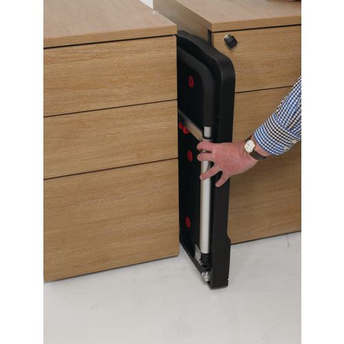 - Castors fold underneath platform for compact storage.