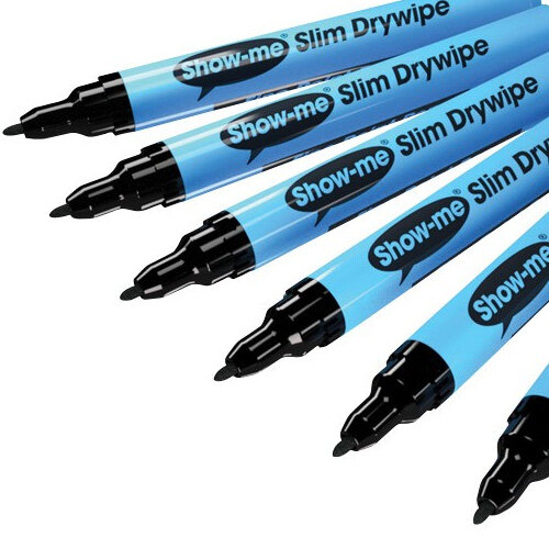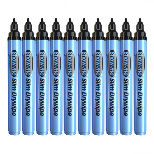 - Show-Me Fine Point Slim Barrel Dry-Wipe Marker Black 10 Pack. Has 24 Hour Cap-Off Time To Prevent Drying Out. Ideal For Schools, Colleges, Offices, Homes & More.